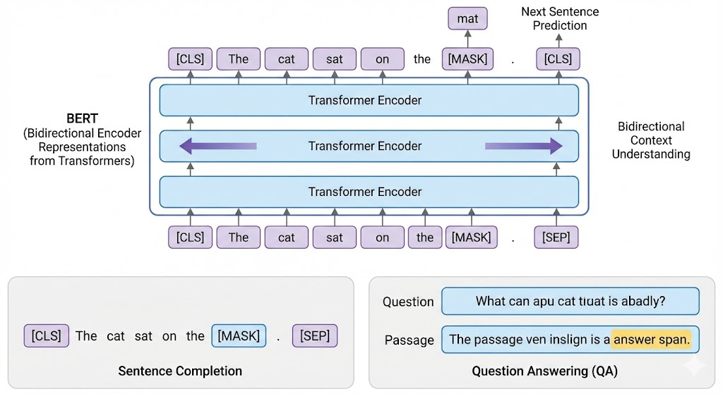 - BERT (Bidirectional Encoder Representations from Transformers) - 문맥을 양방향으로 이해할 수 있도록 설계된 트랜스포머 기반 모델로, 문장 완성, 질의응답 등 다양한 NLP 작업에 사용됨.